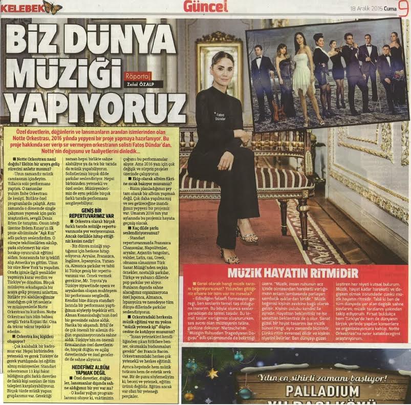 Tüm müzik severlere açılışlarda, özel davetlerde ve görkemli düğünlerde kaliteli müzik sunar. Notte orkestrası dinleyicilerinin özel günlerini unutulmaz ve keyifli dakikalara dönüştürür.